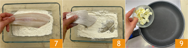 Flour the cleaned soles on both sides 7, making sure to remove any excess flour 8. Now move to the stove: melt the butter in a large pan 9 over medium-high heat.