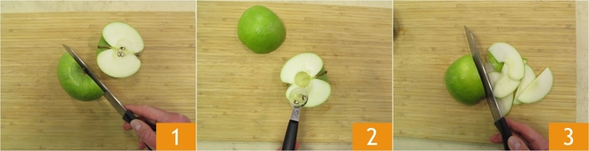 To prepare the South Tyrolean Club Sandwich, first cut the apple in half 1, remove the core with a corer 2, and slice into thin pieces 3.