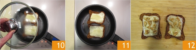 Cover with a lid 10, lower the heat, and let the cheese melt 11. Place the walnut halves on the melted cheese 12.