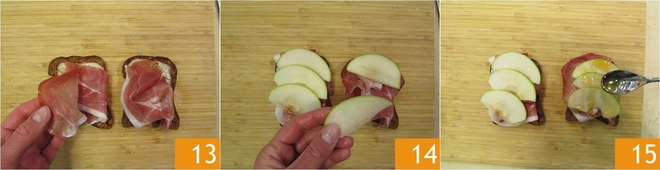 Add the slices of speck 13 and apple slices 14. Drizzle a bit of honey on the apples 15.