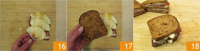 Now place one filled slice of bread on top of another 16 and cover with one of the two remaining slices of bread 17. Do the same for the second sandwich 18 and serve your South Tyrolean Club Sandwich!