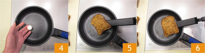 Now in a pan, add a pat of butter 4 and, as soon as it melts, place the slices of bread inside 5. Toast them on both sides over high heat 6 until golden brown.