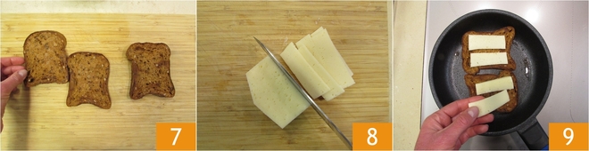 Transfer the slices of bread to a cutting board 7. Slice the cheese 8 and place it on only 4 of the 6 slices of bread. Place them back in the pan 9.