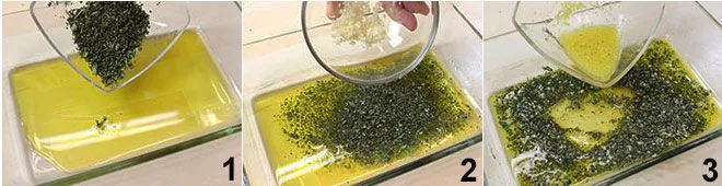 To prepare the foil-baked swordfish, start with the marinade: in a large bowl, pour the extra virgin olive oil and chopped herbs 1, making sure to set aside a tablespoon to add later in the foil. Add the minced garlic 2 and the juice of half a lemon together with the grated lemon zest 3.