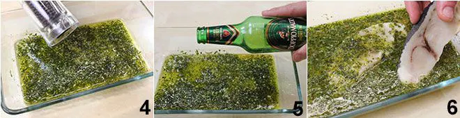 Add salt and pepper 4 and finally add the strong beer 5. Submerge the swordfish slices in the marinade 6 and let them rest for at least an hour, or if you want to prepare it in advance, overnight.