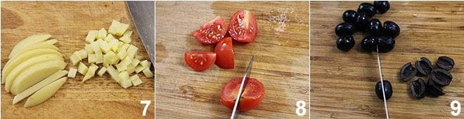 In the meantime, prepare the vegetables for the foil: cut the potato into chunks 7, the cherry tomatoes in half 8, the spring onion, and the black olives 9.