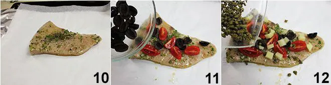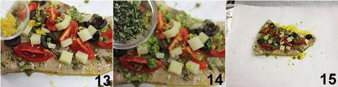 On a baking sheet, prepare everything you need for the foil pack: lay a sheet of aluminum foil, on top of it a sheet of parchment paper, and place one of the two slices of swordfish that you have taken out of the marinade in the center 10. Start seasoning the fish with the chopped vegetables and the capers, rinsed and wrung out (11-12).