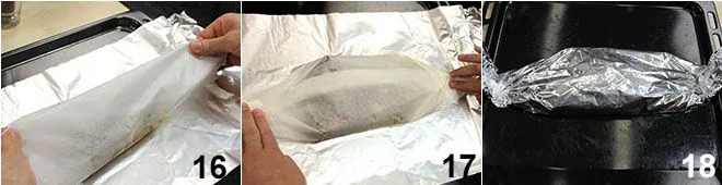 Preheat the oven to 400°F, close the foil packets by folding the parchment paper in the center first 16 and then folding the sides 17, and do the same with the aluminum foil 18. Cook for at least 25 minutes, check the doneness of the swordfish (it depends on the thickness of your slice, if necessary leave it in the oven for another 5 minutes) and then remove it from the oven and serve it on two plates with its cooking juices!