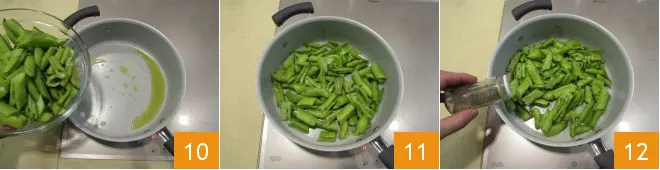when the oil is hot, remove the garlic and add the cut peels 10, letting them season for a few minutes on high heat 11 and adjust with salt and pepper 12.