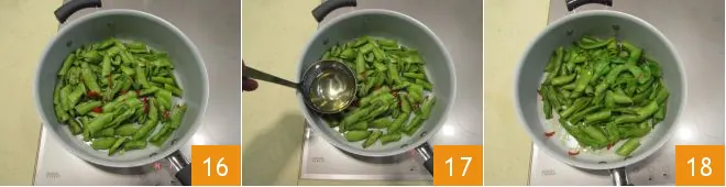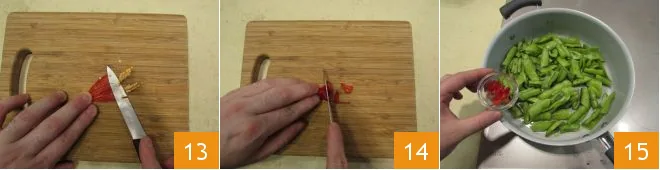 Meanwhile, slit a chili pepper, remove the seeds 13, then cut it into strips 14 and add them to the broad bean peels 15.