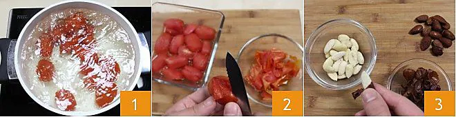 To prepare spaghetti with Trapanese pesto, follow the recipe for the pesto. First, prepare the peeled tomatoes: put a large pot full of water on the stove. Wash the tomatoes and make a cross cut at the end of each tomato. When the water starts to simmer, scald the tomatoes for 2-3 minutes 1, then peel the tomatoes 2 and cut them into cubes. At this point, peel the almonds: blanch them for a few minutes in boiling water, drain them, and then just apply gentle pressure with your fingers to remove the skin 3.