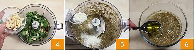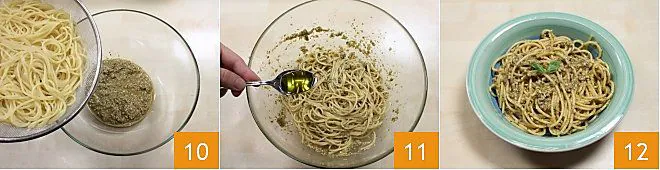 Add them to the Trapanese pesto 10, stir to blend the sauce well, season with a drizzle of oil 11, and bring your spaghetti with Trapanese pesto to the table garnished with fresh basil leaves to taste 12.