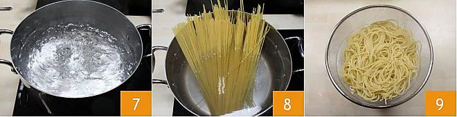 Now take care of the pasta: put a pot with a tall base suitable for cooking spaghetti on the stove, once it reaches boiling 7 add the spaghetti 8. Cook the pasta al dente and then drain it 9.