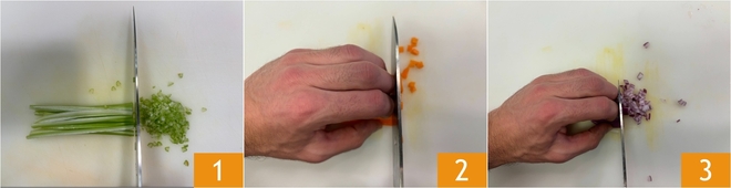 To prepare the spaghetti with meat sauce and meatballs, start by washing and cleaning the vegetables for the sauce sauté: cut the celery 1 and carrot 2 into sticks and finely chop them, then do the same with the onion 3.