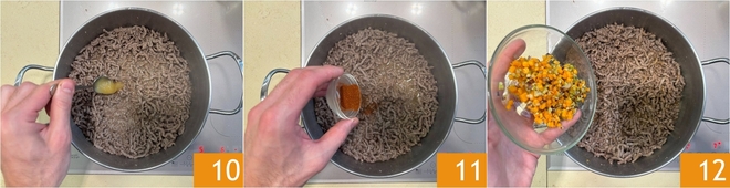 Add the honey 10, the paprika 11, and the sautéed vegetables again 12.