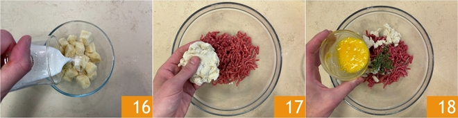 Meanwhile, prepare the meatballs: soak the bread cubes in milk 16, then squeeze well and transfer to another bowl where you have the ground meat 17. Add thyme, grated cheese, beaten egg 18, and salt.