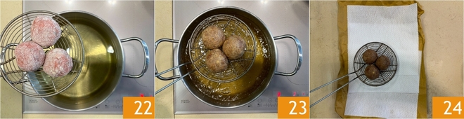Heat the seed oil in a pot, and when it reaches a temperature of about 338°F-356°F, immerse the meatballs 22, a few at a time, and fry until golden brown 23. Drain the meatballs on a tray lined with absorbent paper to dry the excess oil 34.