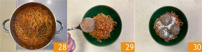 Once ready 28, serve the spaghetti dressed with the sauce, also adding the meatballs to the plate 29. Complete with a sprinkle of grated cheese and serve the spaghetti with meat sauce and meatballs 30 immediately!