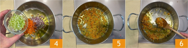 In a large pan, heat a drizzle of oil, then add the chopped vegetables 4 and let them stew gently for a few minutes until tender 5. Remove the sauté from the pot 6 and set aside.