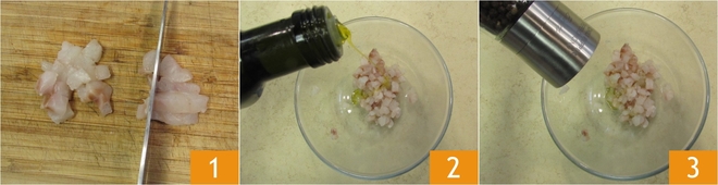 To make the spaghetti with Monte Veronese sauce and sea bass tartare, first chop the fish filets with a knife, after removing any bones 1. Transfer the sea bass to a bowl and season with oil 2 and pepper 3. Mix and cover with plastic wrap, then leave in the refrigerator until ready to use.