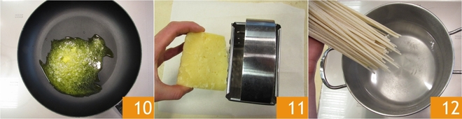 While the pasta is cooking, prepare the Monte Veronese sauce: pour the grated cheese into a non-stick pan 13, add the cream 14 and mix over low heat to melt it completely. Once ready, set the Monte Veronese sauce aside 15.