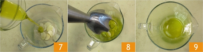 Transfer the cloves to a beaker, add the oil 7 and blend with an immersion blender 8 until you obtain a homogeneous consistency 9.