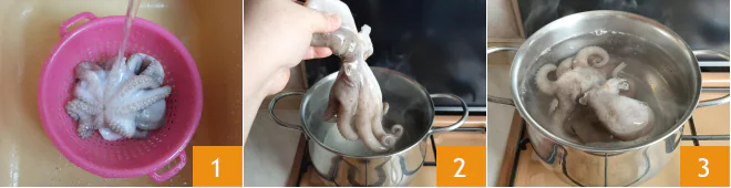 To prepare the spaghetti with octopus puttanesca, first rinse the octopus under running water 1. Bring a pot of water to a boil and dip the octopus tentacles twice so that they curl up 2, then immerse it completely and let it boil for 30 minutes 3.