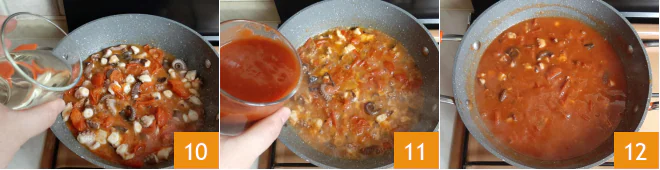 At this point, remove the garlic clove and deglaze with white wine 10. When the alcohol has completely evaporated, season with salt and pepper and pour in the tomato puree 11. Cook gently for about 15-20 minutes 12.