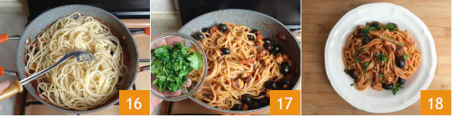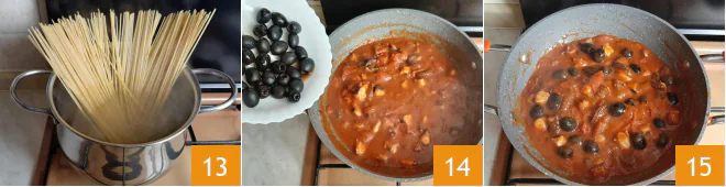 Meanwhile, the water will have come to a boil, so salt it and drop in the spaghetti 13. A couple of minutes before the sauce finishes cooking, add the black olives 14 and mix well, then turn off the heat 15.
