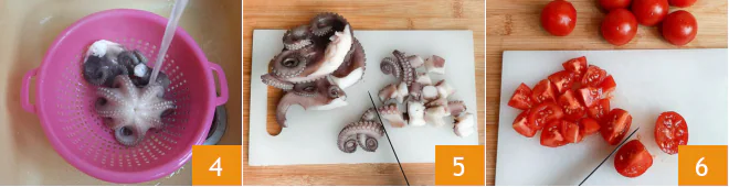 Once cooked, drain the octopus and cool it under running water 4, then cut it into small pieces 5. Wash the cherry tomatoes and cut them into wedges 6. Put a pot of water on the stove to cook the pasta.