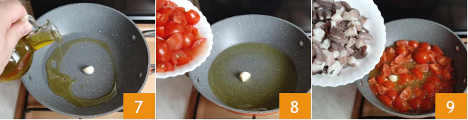 Pour the oil into a large pan, add the garlic clove 7 and cherry tomatoes 8 and sauté for 5 minutes, then add the octopus 9, stir and let everything season for another 3-4 minutes over medium-low heat.