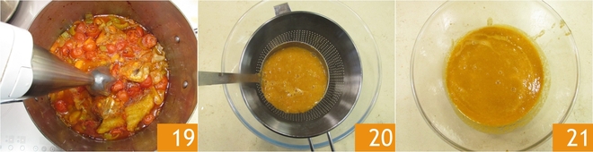 After the cooking time, blend the base with an immersion blender 19 and strain it through a chinois 20 to achieve a smooth and homogeneous consistency 21.