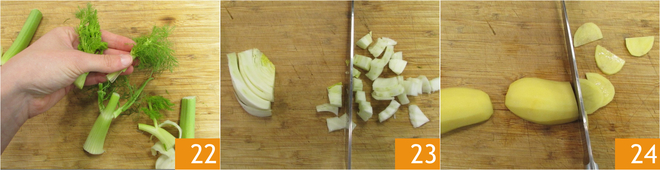 While the base is cooking, you can start on the fennel cream: cut the fennel stalks and set aside the fronds 22, then divide the fennel into 4 wedges, remove the harder central part and chop the rest into pieces 23. Peel the potato and slice it thinly 34.