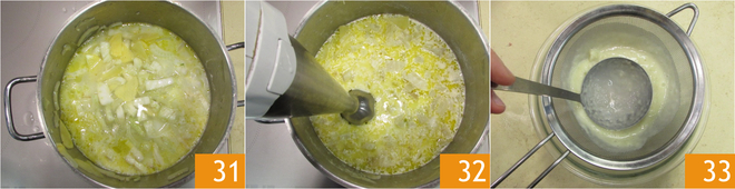 Let it cook for about 40 minutes 31. After this time, add the fennel fronds and blend with an immersion blender 32, then strain the resulting cream through a chinois 33.