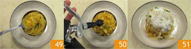 Plate the pasta using a ring, then pour over the sauce 49 and finish with the fennel foam 50. Garnish with a few sprigs of wild fennel and a grind of pepper: your spaghettone with mullet ragù is ready to be served 51!