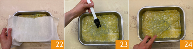 Add a final sheet of phyllo dough to cover everything 22 and brush one last time with oil 23. Make diagonal cuts across the entire surface 34.