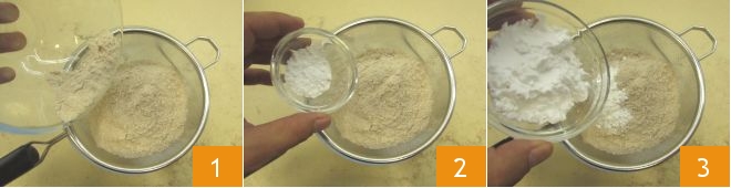 To prepare the spelt and yogurt cake, start with the dry ingredients: in a bowl, sift the spelt flour 1 with the baking powder 2 and potato starch 3. Once this operation is done, set the bowl aside for a moment.