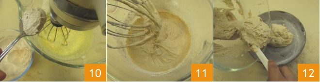 At this point, also add the previously sifted dry ingredients, adding them one tablespoon at a time 10. Once you have added all the powders and obtained a smooth, lump-free batter 11, pour the batter into a 9-inch diameter springform pan, greased and floured 12.