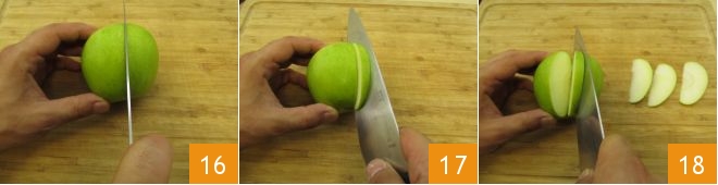 Now move on to the apples: wash them well and cut them into wedges (16-17), obtaining wedges about 1/8 inch thick 18.