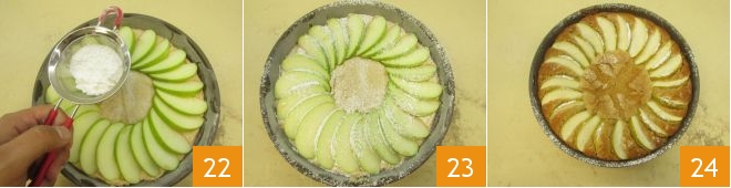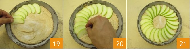Arrange the apple wedges on the surface of the cake, slightly overlapping them (19-20) and forming a circle, leaving the center of the cake empty 21.