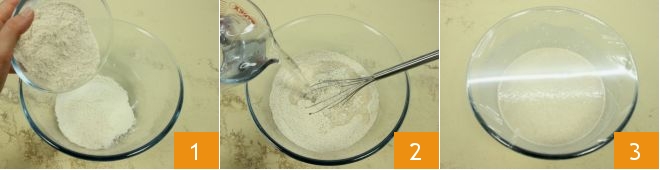 To prepare the spelt crepes with caponata, start with the crepe batter: in a bowl, sift the type 0 flour and whole spelt flour 1. Also add the water at room temperature 2 and mix everything with a whisk. Cover the mixture with plastic wrap 3 and let it rest for at least 30 minutes in the refrigerator.