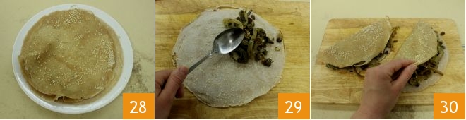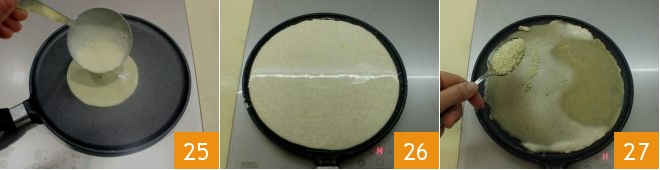 Meanwhile, take the crepe batter; heat a crepe pan and lightly oil it (a non-stick pan about 9 inches in diameter will also do). When it's hot, pour a ladle of batter 25 and spread it over the entire surface 26 using a spatula or the back of a spoon. Cook for about a minute, and before flipping the crepe, sprinkle with white sesame seeds 27.