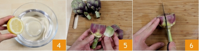 Meanwhile, prepare the caponata. In a bowl, pour cold water and half a lemon 4: this will be used to soak the artichokes to prevent them from turning black before use. Clean the artichokes (you can wear gloves to avoid staining your hands); check the Cooking School guide: How to clean artichokes. Cut off the pointiest part and remove the tough outer leaves 5 until you reach the more tender ones. Then clean the stem by removing the fibrous part and cut them in half 6.