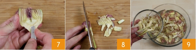Remove the inner choke 7 and cut them into thin slices 8, then put them in the bowl with the acidulated water 9.