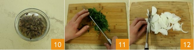 In the meantime, soak the raisins in water 10, chop the fresh mint 11, and set aside. Desalt the capers and slice the pitted green olives. Then also peel the onion and cut it into thin slices 12, then finely chop it.