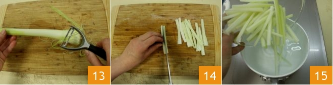 Then remove the fibrous outer part of the celery with a peeler 13 and cut it into julienne strips 14. Blanch the celery briefly in boiling water to soften it 15.
