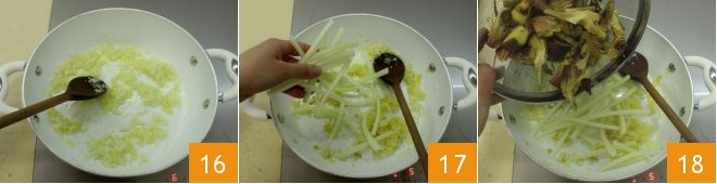 Meanwhile, heat a drizzle of oil in a pan and sauté a peeled garlic clove (which will be removed at the end of cooking) and the chopped onion 16; when the onion has softened, add the celery 17 and the artichokes drained from the acidulated water 18. Let cook over high heat for 5 minutes.