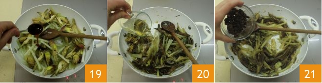 Then add rice malt 19; then deglaze with apple cider vinegar 20, and when it has evaporated, add the well-drained and squeezed raisins 21,