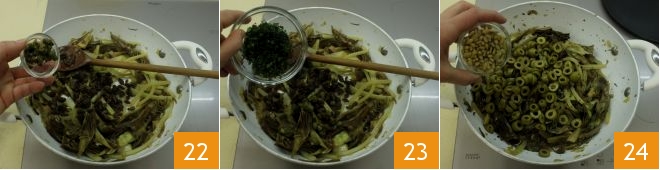 the desalted capers 22, the chopped mint 23, the sliced pitted green olives, and the pine nuts 34. Season with salt and pepper to taste; let cook for about 15 minutes.