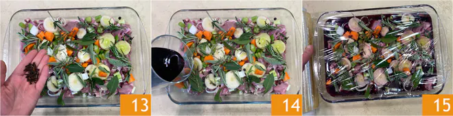Add the cloves 13 as well, then pour in the red wine 14 and cover with plastic wrap 15. Marinate in the refrigerator for another 34 hours.